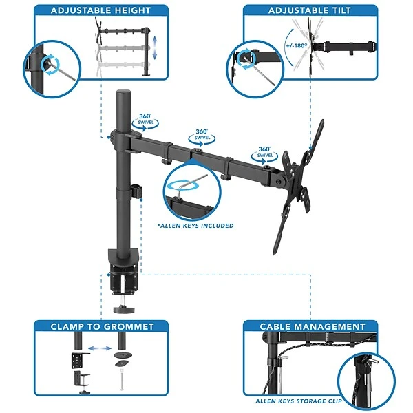 - Swivel: 360 degrees at two joints and 180 degrees at one joint