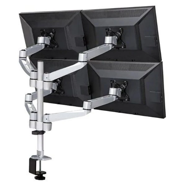 - Quad monitor desk stand for 22″ monitors up to 22lbs each