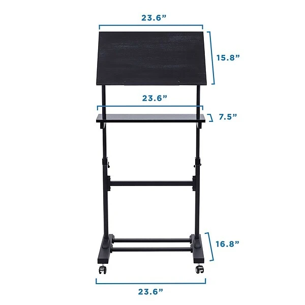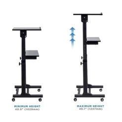 Mount-It! mobile stand-up desk, presentation podium offers versatile uses in your office or business. It is ideal for use as a speaker’s podium and can also be used as a rolling stand-up desk, workstation. Height adjustment feature allows easy transition from sitting to standing and promotes the most ergonomic, comfortable working posture. The frame is made with sturdy steel materials and features built in height adjustment with 11 different locking intervals (minimum height: 40.5″, maximum height: 48.5″). The desk has 2-tiered shelf system allowing for large space requirement. The top shelf measures 23.6 inch wide and 15.8 inch deep, large enough for most laptops and a mouse pad for regular office use.Tilting angle of the top platform can be adjusted from a flat 90 degree to 40 degrees down for your customized comfort. Metal lip at the bottom of the platform keeps your documents neat and organized.We used high-strength steel profile and engineered particle board for optimum strength and lightweight use. The sturdy base keeps the lectern steady, mobile and prevents rollover. 88 lbs of carrying capacity is strong enough for regular use.Premium 2” furniture casters at the bottom can swivel 360 degrees and allow this rolling desk to be moved easily from location to location. Ideal for doctor’s offices with multiple patient rooms, or moving it between meeting rooms in the office. The casters can be locked.