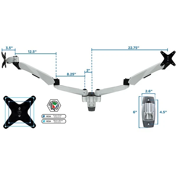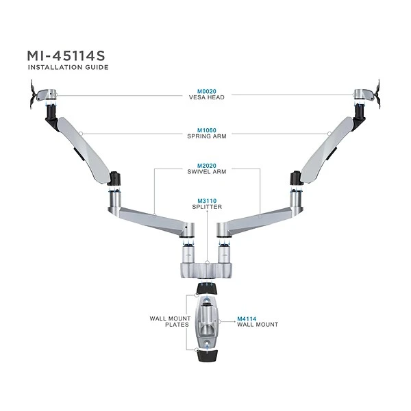 MI-45114 dual monitor wall mount features two gas spring arms for smooth full motion monitor adjustments. From height adjustment, to monitor tilt, swivel and rotation, this monitor wall mount is designed to maximize the user’s efficiency and comfort. Boost productivity and enhance workflow with double the screen space, while improving posture and maximizing space in the office or at home. This premium dual monitor wall mount is fully TAA (Trade Agreements Act) compliant and is suited for purchase by the U.S. government. It is a modular monitor mount, meaning it is fully customizable with the ability to add, remove, shorten or lengthen each of the monitor-mounting arms, which allows an organization to develop cost-effective, tailored solutions for their employees’ needs. The easy to install wall mount requires only a single stud for installation making it a quick addition to any workspace. Each arm features a cable management port to hide and organize cables for a clean look. Each arm can carry monitors measuring in size up to 32” and up to 19.8lbs per mounting arm.