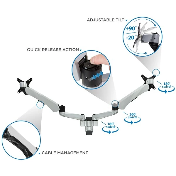 - Gas Spring Arms have Tilt, Swivel, Height Adjustable and Rotating Features