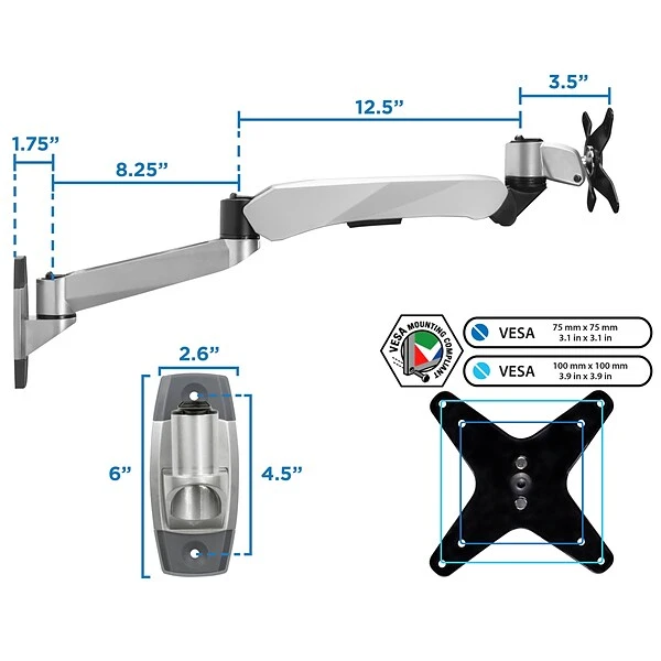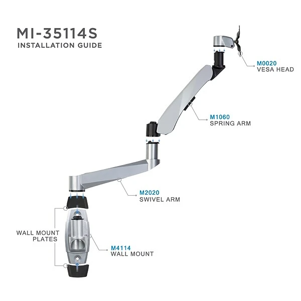 MI-35114 single monitor wall mount features an articulating gas spring arm for smooth full motion monitor adjustments. From height adjustment, to monitor tilt, swivel and rotation, this monitor wall mount is designed to save space while improving posture by raising the monitor to eye level in any type of environment. This premium monitor wall mount is fully TAA (Trade Agreements Act) compliant and is suited for purchase by the U.S. government. It is a modular monitor mount, meaning it is fully customizable with the ability to add, remove, shorten or lengthen the monitor-mounting arm, which allows an organization to develop cost-effective, tailored solutions for their employees’ needs. The easy to install wall mount requires only a single stud for installation making it a quick addition to any workspace. The arm features a cable management port to hide and organize cables for a clean look. Fits monitors measuring in size up to 32” and can hold up to 19.8lbs.