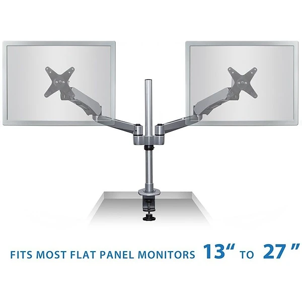 MI-45116B dual monitor mount features two gas spring arms for smooth full motion monitor adjustments. The extra long mounting pole measures 20.5”, allowing for a large height adjustment range. From height adjustment, to monitor tilt, swivel and rotation, this monitor desk mount is designed to maximize the user’s efficiency and comfort. Boost productivity and enhance workflow with double the screen space, while improving posture and clearing up more desk space by elevating the monitors. This premium dual monitor mount is fully TAA (Trade Agreements Act) compliant and is suited for purchase by the U.S. government. It is a modular monitor mount, meaning it is fully customizable with the ability to add or remove monitor-mounting arms, which allows an organization to develop cost-effective, tailored solutions for their employees’ needs. The c-clamp base easily attaches to any desk measuring.79” to 2.36” thick, making it an easy addition to any workspace. It also includes a grommet base that securely attaches to a desktop hole opening. Each arm can carry monitors measuring in size up to 32” and up to 19.8lbs per mounting arm.