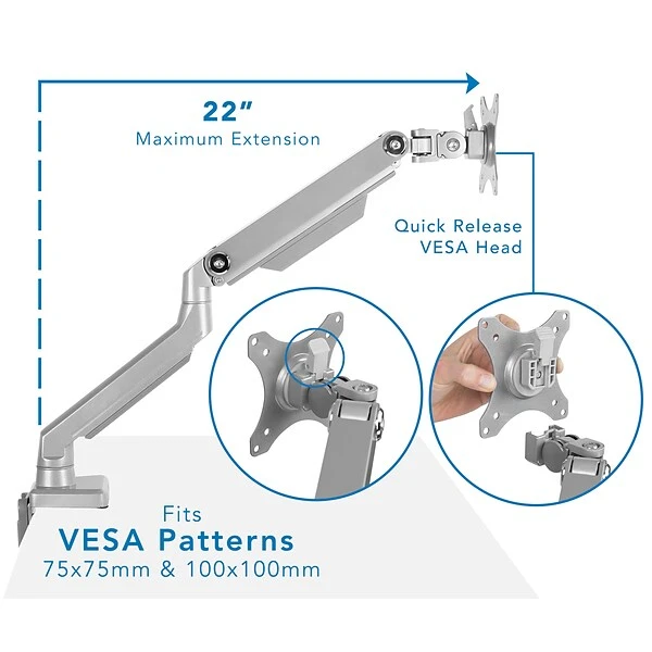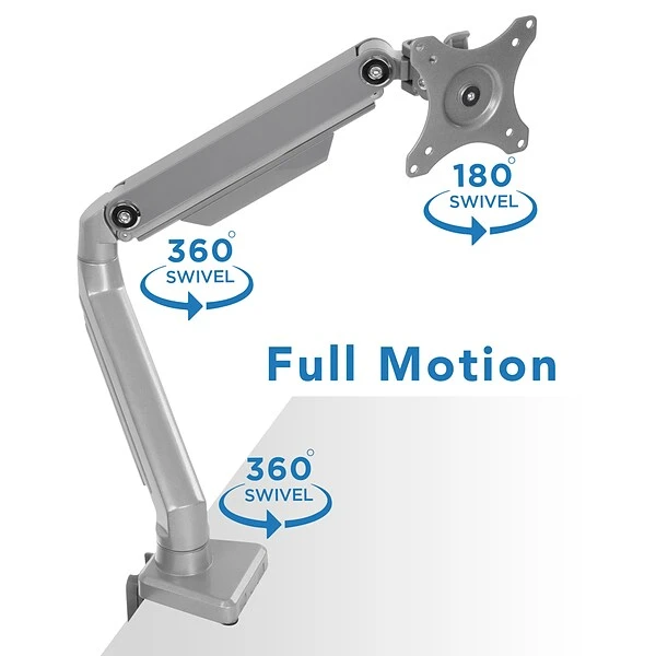 MI-2761 premium monitor desk mount merges functionality with aesthetics. By elevating your monitor above your desk, increase desktop space and get ergonomic positioning of your screens for reduced strain and better sitting posture. Fluid and easy movements and adjustments. The spring arm tension can be adjusted to suit the weight of the monitors, allowing fingertip height adjustment. Single monitor arm adjusts effortlessly for easy use. Full motion arms extend and retract, tilt, swivel and adjust in height. You can also rotate the monitor to switch between landscape and portrait modes.