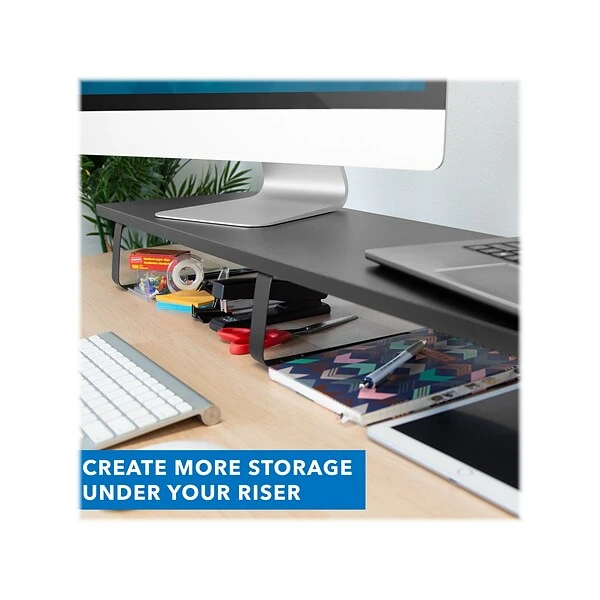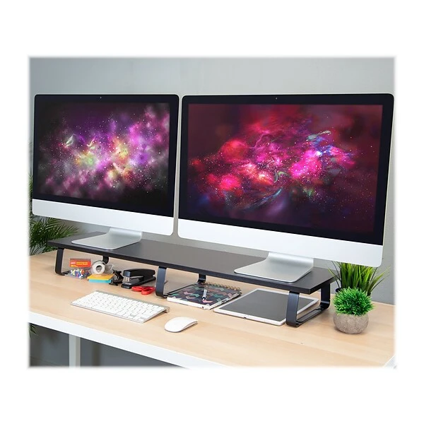 A monitor riser for your dual screens that won’t take up too much space. Place your dual monitor setup on this long 39.4″ wide monitor stand without taking up unnecessary real estate on your desk or home office setup. The extra storage underneath reduces clutter and makes it easy to store away your keyboard, mouse, or other home office supplies when your day is done. The Mount-It! high-quality monitor stand features high-grade steel and premium sourced wood materials.