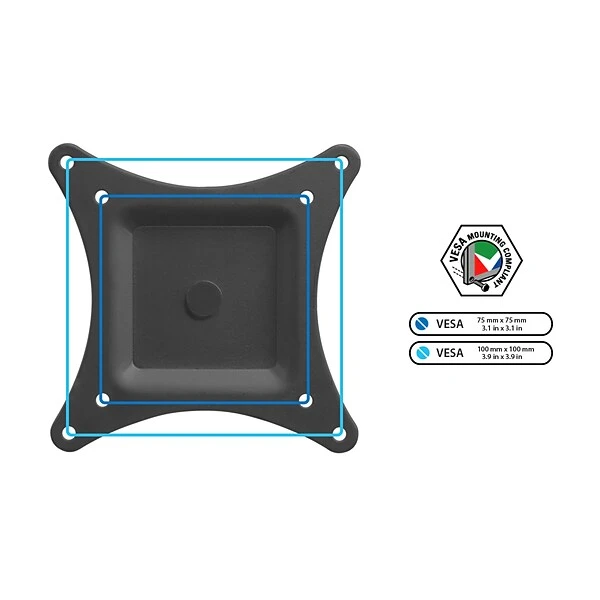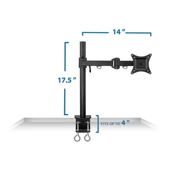 The VESA 75×75 and 100×100 pattern compatibility ensures this product will outlast your screen. If you upgrade, change, or replace your monitor with something newer, you can always find something compatible with these common VESA configurations. The lasting design is matched by an exponential increase in display functionality and aesthetic appeal. Your display will dynamically integrate itself within your work space as a functional and beautiful device. The tilting, pivoting, and swiveling functions create a myriad of new found utilities. Create ergonomic settings with the adjustable height pole and tilt features to reduce neck, back, and eye strain. Utilize the tilt and swivel features to fight sun glare and find the optimal settings for your screen brightness and contrast settings. Well Engineered The elegant aluminum steel alloy is powder coated with a sleek black finish. The integrated cable management system and raised mounting head make this stand a cut above the rest. With organized cables and an open desk, your work space will look more contemporary and be more manageable than ever. No more shuffling your keyboard at odd angles or sliding papers under your appliances, you will have your desk back. Hardware and installations guides are included Features Height adjustable. 17.5″es Tilt: +/- 90 degrees, Swivel: 180 degrees, Rotate: 180 degrees, Secondary Rotate: 180 degrees Fits most flat panel monitors from 13 to 27″es. Supports up to 22 lbs. VESA mounting pattern: 75x75mm or 100x100mm Cable Management Clips C-clamp fits up to 4″ desks