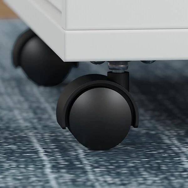 Embrace the unique styling of mid century modern design and enjoy flexible storage with the Office by kathy ireland® Method 3 Drawer Mobile File Cabinet. Constructed of 100% thermally fused laminate, the filing cabinet fends off scratches and stains and offers beautiful titanium finished hardware. Move your files around the office with ease as the modern cabinet rolls on smooth casters. Organize your paperwork in the full-extension file drawer, which opens effortlessly on ball-bearing slides. A lock secures the lower two drawers for your privacy, and the Mobile File Cabinet fits conveniently under your desk. Use the box drawers to clear your office from clutter and keep supplies by your side. From Office by kathy ireland® and Bush Business Furniture, the Method collection comes with a 6 Year Warranty and meets ANSI/BIFMA standards. American made with U.S. and imported parts.