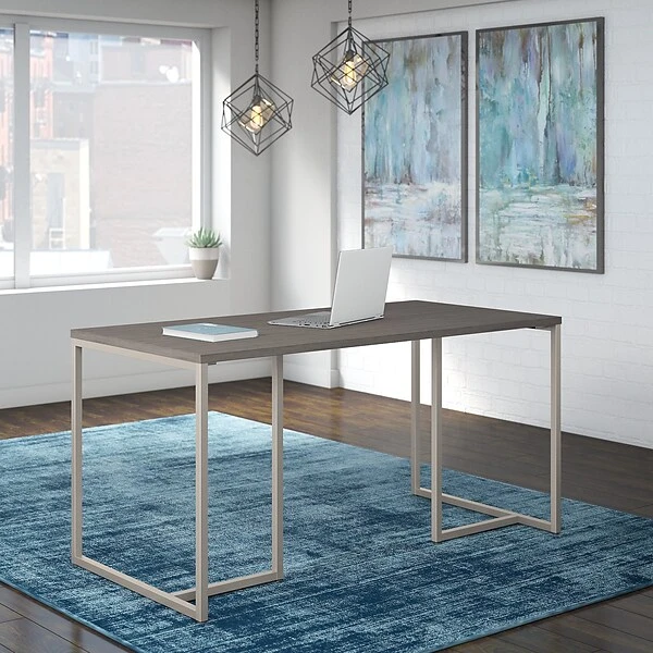 Express your unique style and personality while working hard for years with the commercial-grade Office by kathy ireland® Method 60W Table Desk. Whether you’re a work from home parent, small business owner or entrepreneur, Method gives your office the urban appeal of mid century modern styling with a beautiful blend of metal and wood. Constructed of 100% thermally fused laminate, the durable Table Desk surface resists scratches and stains. The titanium finished metal base provides structural strength with an attractive open design allowing ample legroom. From Office by kathy ireland® and Bush Business Furniture, the Method collection comes with a 6 Year Manufacturer’s Warranty and meets ANSI/BIFMA standards. See the full line of commercial office furniture to expand your workplace. Give your office a uniquely modern charm with Method. American made with U.S. and imported parts.