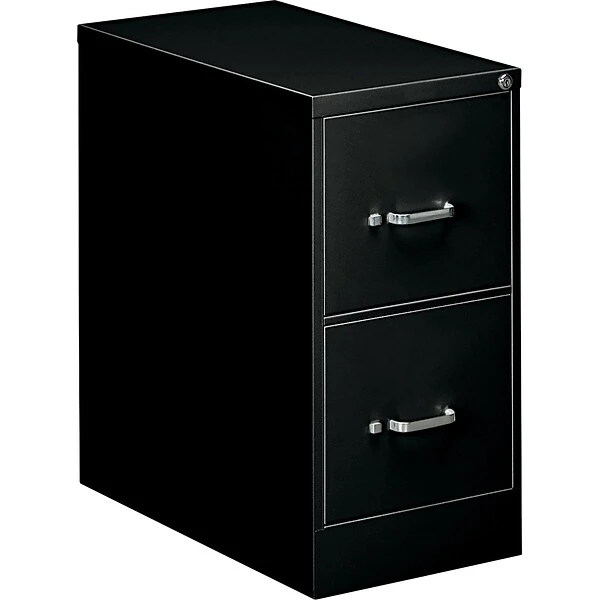 The OIF Economy vertical file with two drawers can hold letter-sized files and comes with wire follower blocks that let you store the files vertically. Place this file next to your desk to ensure you have access to all your important documents. Remove the core lock, and use this file cabinet to store frequently used forms and files. This black file cabinet has aluminum latches that make it easy to pull its sturdy drawers open.