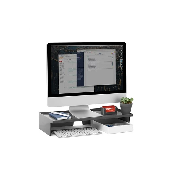 The Poppin monitor stand takes your desktop to new heights. It not only kicks your computer screen up a notch, it also doubles as an all-purpose shelf, turning your desk into a duplex. Designed to fit with accessory, letter, and slim trays, so you can mix, match, and stack to bring your desk to a whole new level. A cable cutout in the back keeps cords out of your way, keeping you free from entanglements.
