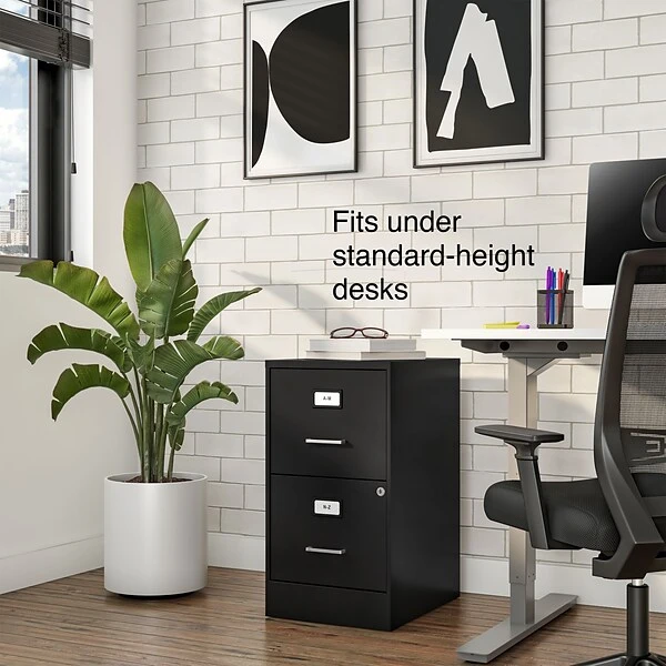 - Two-drawer light duty filing cabinet holds letter size documents
