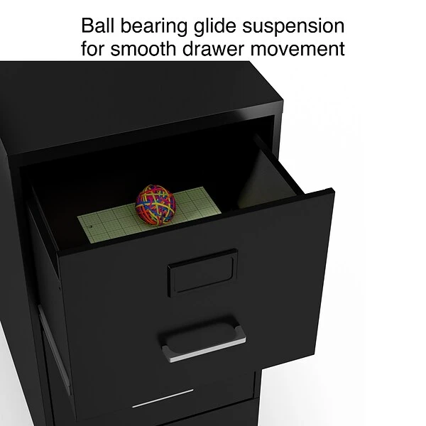 Organize your home or small office with the 2-Drawer light duty vertical file cabinet. Keep all your letter-sized documents secure and tucked away in two 18” depth drawers. Label both drawers with the two built-in label holders allowing for quick identification of the contents in each drawer. This file cabinet comes equipped with one factory installed lock and key, controlling both drawers for peace of mind and security. The sleek black finish handles keep your office space looking contemporary and organized. This cabinet is backed by a 7-year limited warranty, keeping you satisfied for years to come.