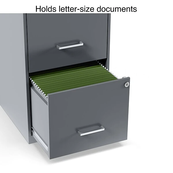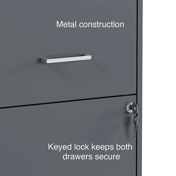 This 2-Drawer Vertical File Cabinet in Graphite lets you easily store gadgets and organize records. This vertical file cabinet features two deep drawers for letter-size hanging files and designer handles and glide suspension for smooth drawer movement. This 2-Drawer Vertical File Cabinet comes in a stylish graphite baked-enamel finish that fits in any room. The cabinet also comes with a built-in lock to secure your important files. Made from 30 percent post-consumer materials, this responsible 2-drawer file cabinet is backed by a one-year warranty.