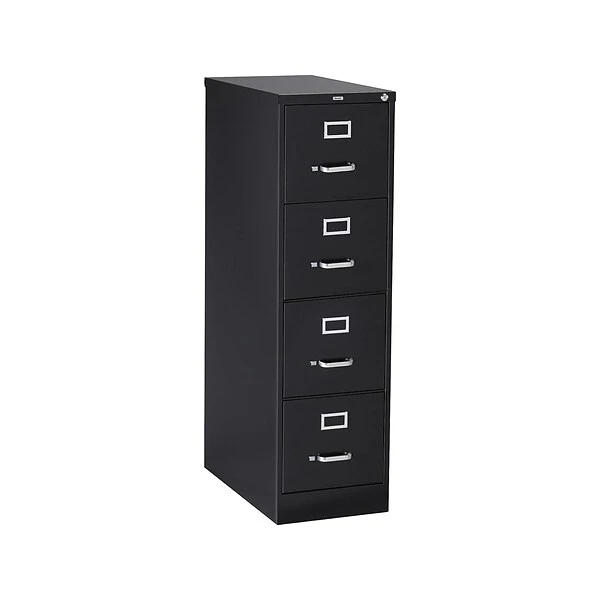 Organize client files or daily paperwork with this vertical file cabinet. Each of the four drawers locks to keep important documents secure, and the 26.5-inch depth provides ample room for all your file storage needs. This sturdy file cabinet features convenient label holders, so you can assign each drawer a specific purpose. With a sleek black finish and silver-tone accents, this office cabinet makes a handsome addition to a reception area, executive office or file room. The durable metal construction delivers enduring quality, even in busy office environments. This vertical file cabinet accepts letter-size files for versatile document storage options.