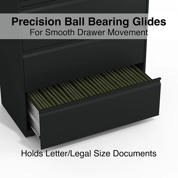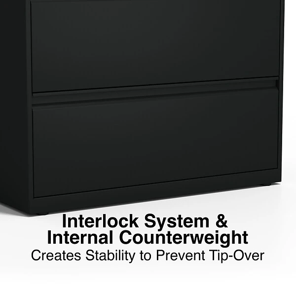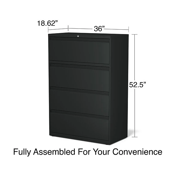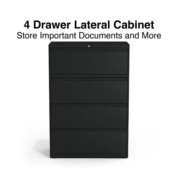 Get a durable, large-capacity solution for business record-keeping with this four-drawer lateral file cabinet. Boasting a small footprint, this cabinet fits easily in most workplaces and provides ample space for storing letter, legal and A4-size documents with four 36-inch-wide drawers. Wide drawer pulls and three-piece ball-bearing suspensions offer easy access to stored materials, while a built-in lock makes it easy to secure sensitive documents. This lateral file cabinet lets you file documents side-by-side with its adjustable hangrails.