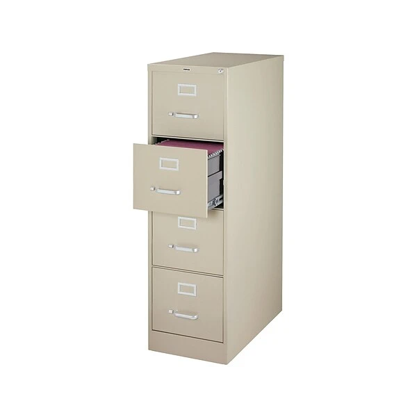 Keep paperwork neatly stored away in this four-drawer vertical file cabinet. Each drawer locks to keep sensitive documents safe while you’re away from the office, and silver-tone label holders take the guesswork out of filing documents. Ball-bearing suspension allows for smooth, easy opening of each drawer, so you can access client paperwork quickly. This file cabinet holds letter-sized hanging files, providing a convenient and versatile option for organizing everyday reports, customer information and invoices in one place. This four-drawer vertical file folder comes in a neutral putty color, providing a classic look that’s perfect for use in offices, schools, medical practices and homes.