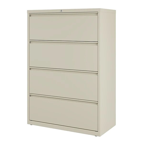 Keep track of important records, documents and project materials with this four-drawer lateral file cabinet. Ideal for making efficient use of space, this cabinet easily fits in small workplaces and enhances existing decor with its professional appearance. The four 36-inch-wide drawers open and close smoothly with three-piece ball-bearing suspensions and provide ample space for letter and legal-size files, perfect for long-term document storage. This lateral file cabinet keeps sensitive documents safe and secure with a built-in lock.