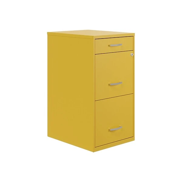 The Space Solutions SOHO Organizer three-drawer metal vertical file cabinet is the perfect storage solution for any small office or home office. Featuring two file drawers and an additional small storage drawer, this file cabinet is the perfect solution for your home office needs. This file cabinet features a smart, efficient design that works well in smaller spaces, and fits under most work surfaces or desks. Each drawer features high sides to accommodate letter-size hanging files. The top pencil drawer can also be perfect storage for other office essentials. Using a patented glide suspension, the drawers have a smooth open and close slide with a three-quarter drawer extension. In addition, you can keep your files and possessions secure by using the built-in lock for both drawers. Painted steel surface is nonporous and easy to clean. Bring organization and function to your home or office with this three-drawer file cabinet.