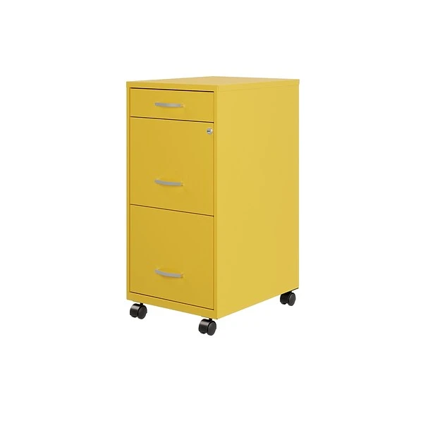 The Space Solutions SOHO Organizer three-drawer mobile letter-width vertical file cabinet is perfect for storing files, supplies, and accessories for your small office or home office. Features two file drawers and a small storage drawer. The compact size fits under most work surfaces or desks. Each drawer features high sides to accommodate letter-size hanging files. The top pencil drawer is the perfect storage for other office supplies. The wheels that come with this file cabinet make it easy to move around your home or office. Using a patented glide suspension, the drawers have a smooth open and close slide with a three-quarter drawer extension to prevent tipping. In addition, you can keep your files and possessions secure by using the built-in lock for the two top drawers. Painted steel surface is nonporous and easy to clean. Bring organization and function to your home or office with this three-drawer mobile metal file cabinet.