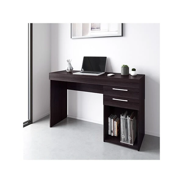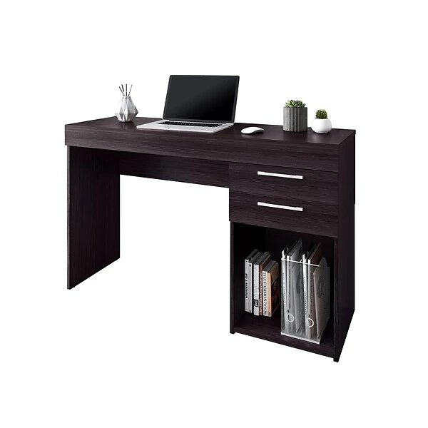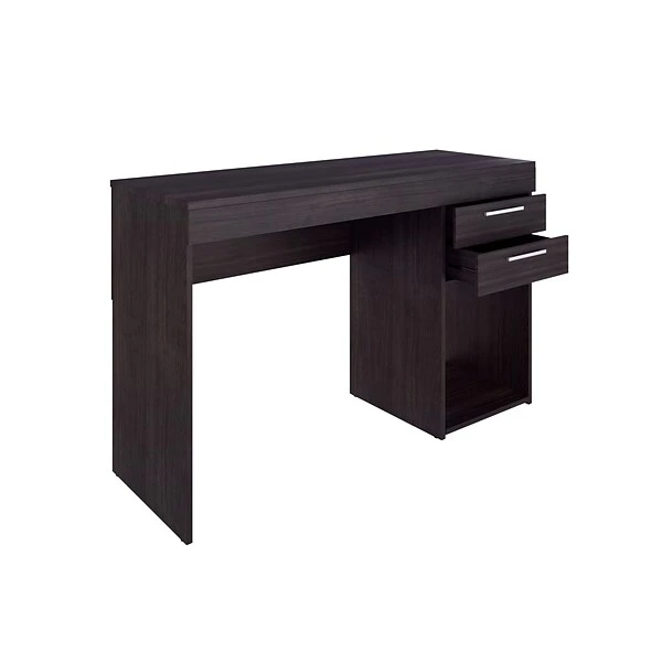 This contemporary workstation desk brings a touch of sophistication to your workspace. Its design is perfect for home offices, offering a generously extended work surface with ample storage. Crafted from durable particleboard with a painted surface, this classic desk with modern appeal makes a statement to any decor. The two pullout drawers keep office essentials within reach while the open shelf at the bottom aids in keeping clutter under control.