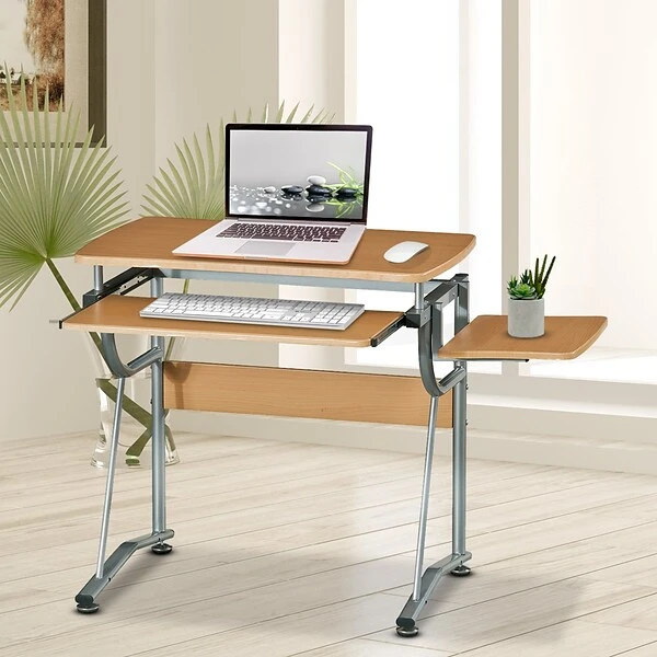 Place this desk in your student’s room, home office or work area. Ideal for small spaces, this cherry desk features a sliding keyboard shelf and a convenient side shelf to house your printer. The smooth laminate finish is moisture and scratch resistant, and the durable steel frame gives this small desk a weight limit that is sufficient for most common computer peripherals.
