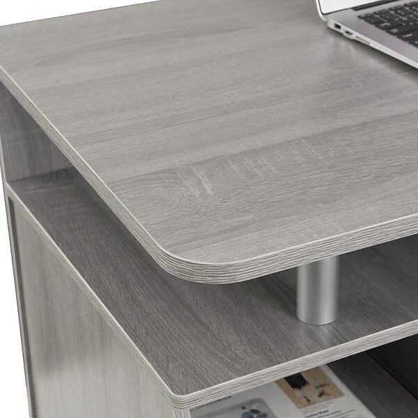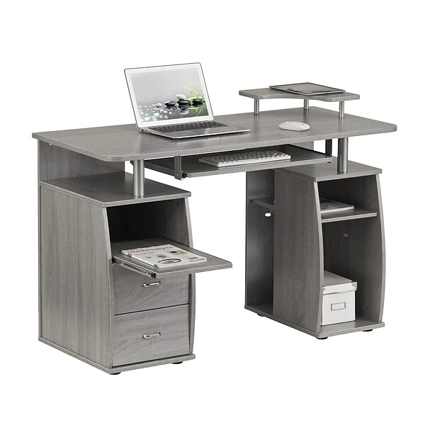 The Techni Mobili Dual Complete Computer Workstation Desk includes an elevated accessory shelf, slide-out keyboard and accessory shelves—both equipped with safety stops, 2 storage drawers, and an open CPU compartment with a shelf that can be moved up, down or completely removed. The elevated desktop provides additional storage above the pedestals. The slide-out accessory shelf and CPU compartment each have rear cable openings. The desktop has an 80 lbs. weight capacity, while the shelves can each hold up to 30 lbs., and the drawers each have a 22 lbs. weight capacity. This amazing multifunctional desk is made with MDF panels in Gray color, with a moisture laminate veneer. It’s stylish frames are made of scratch-resistant powder-coated steel, adding elegance to it’s fine design. Color: Gray