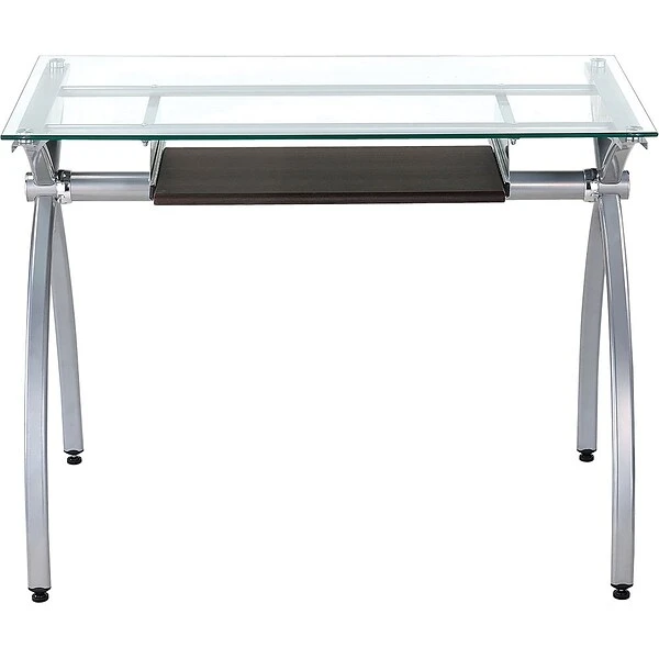 The contempo style of this Techni Mobili Glass-Top Computer Desk brings a crisp and smart ambiance to any office. It features a heavy-duty 8 mm tempered safety glass desktop, the stylish lines of a curved scratch-resistant powder-coated steel frame, and a pull-out keyboard panel with moisture resistant PVC laminate veneer in a Mahogany finish. With its compact footprint you can furnish your workspace with style and efficiency. The desktop has a 110 lbs. weight capacity and the keyboard shelf has a 33 lbs. weight capacity. It is ready and easy to assemble . Color: Clear Glass & Mahogany Keyboard