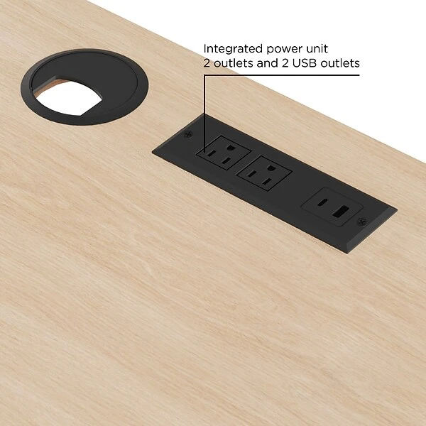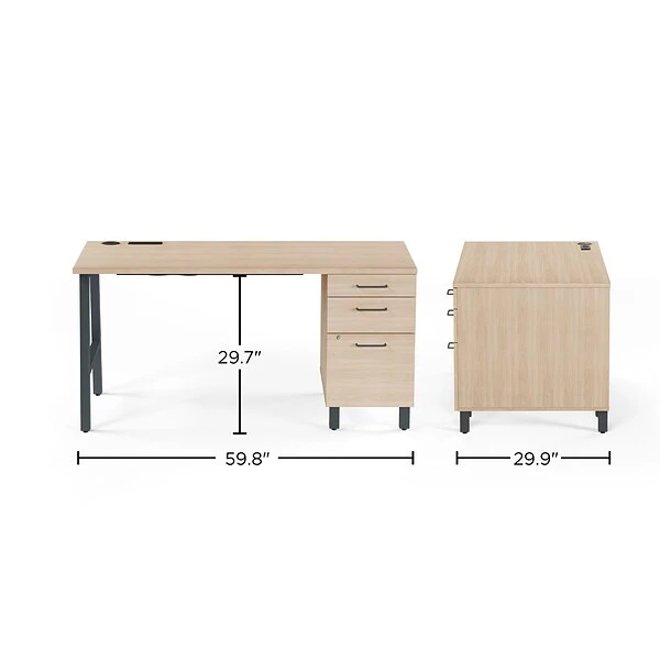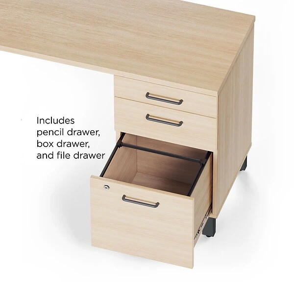 Store files and folders conveniently at work with this Union & Scale™ single-pedestal desk. The three drawers provide ample storage space for everyday office essentials, while the leveling glides enable stable positioning. Featuring locks, this desk secures important and sensitive office documents from unauthorized access, and the metal A-frame legs provide sturdy support. This Essentials natural single-pedestal desk boasts a cable management tray to keep wires neatly tucked and a laminate top to add a sophisticated style to your office furnishings.