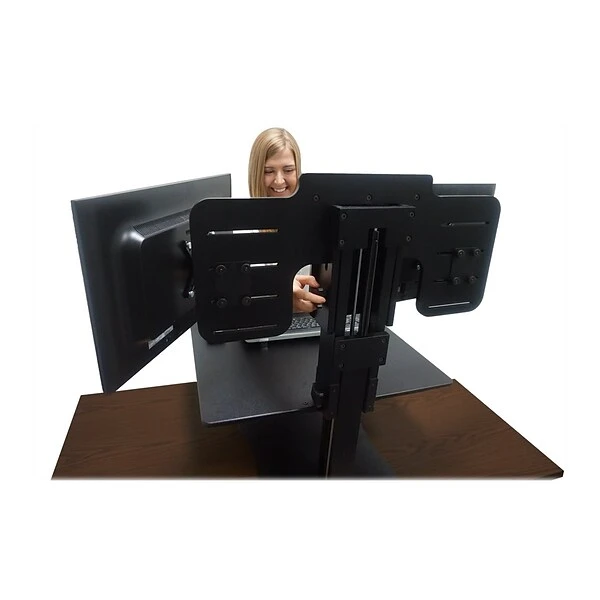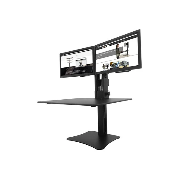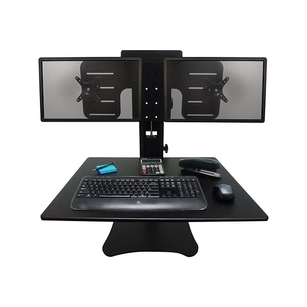 The wood construction on this dual-monitor desk converter keeps the unit sturdy, ensuring your computer and other work equipment stays secure. A laminate coating increases the durability of the piece, protecting it from scratches and other damage while giving it a sleek black appearance. The dual-monitor desk converter securely hold monitors up to 22 inches wide so they won’t shift or fall as you raise or lower the converter.