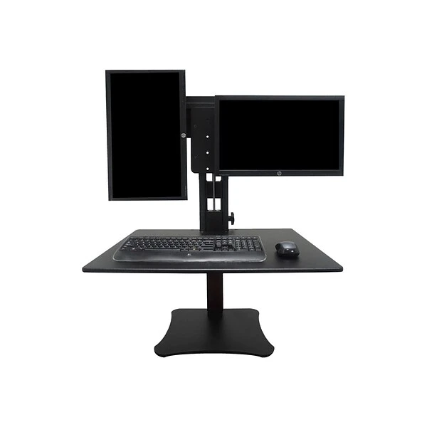 Work in your preferred posture and multitask more easily with this desk converter, which can hold up to two 24-inch monitors and adjusts from sitting to standing height with the twist of a knob. This Victor Technology High Rise desk converter includes a 23 x 28-inch work surface to keep a keyboard, mouse, notepad or phone easily accessible in either position.