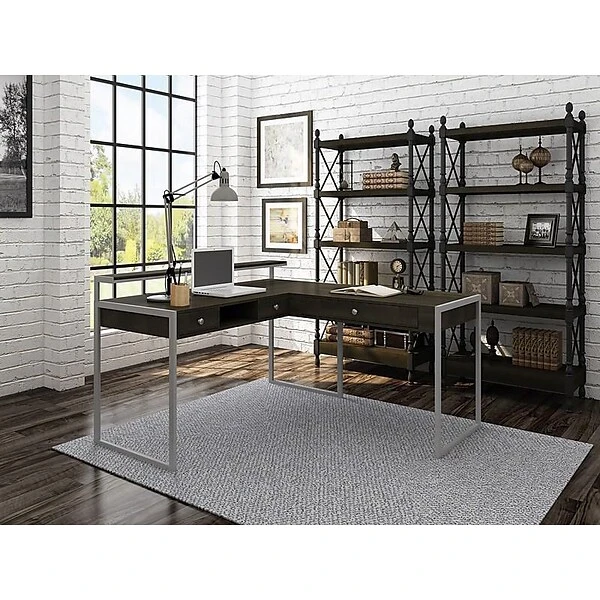 Enhance productivity and give your office a modern touch with this Whalen Asherton L desk. Ideal for maximizing office space, this understated desk fits easily in most workspaces and enhances office decor with its sturdy titanium-finished metal frame and handsome harvest oak finish. The L-shaped design offers ample space for computers and office equipment, while the built-in riser provides space for displaying photos and personal items. This Whalen Asherton L desk offers plenty of storage with three built-in drawers.