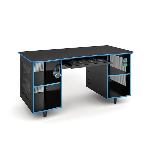 Assemble a complete set of gaming gear on this black computer desk. The spacious tabletop offers plenty of room for multiple monitors, and the ventilated storage cabinets, accessory trays and cable management ports provide neat organization for a CPU and peripherals. The cut-away curved front design of this Whalen Emergent Gaming desk keeps gamers up close to the cyber battlefield.